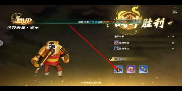胜利之后会出现结算界面,你可以在这里查看得到的奖励道具以及战斗数据,点击界面上的任意位置就能关闭它,这样就完成了本次关卡的挑战。