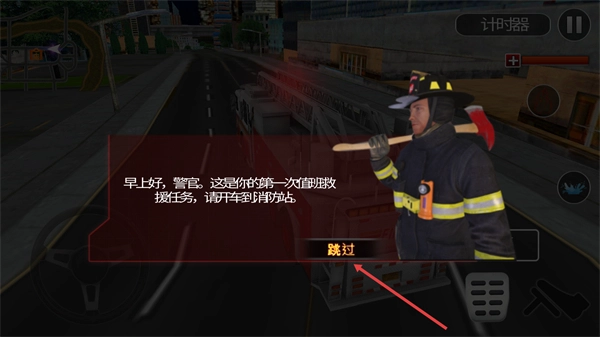 进入任务后会弹出任务提示框,点击跳过按钮可快速关闭提示,直接进入消防车驾驶环节。