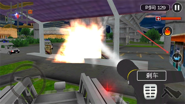 抵达火灾现场后,点击右侧的喷水按钮,将喷水区域对准火焰位置进行操作,就能完成这次消防救援任务。