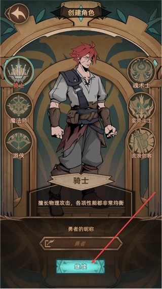 在角色创建界面选择骑士职业,这个职业擅长物理攻击,各项性能也十分均衡,输入勇者的昵称后点击继续按钮,就能完成角色创建了。