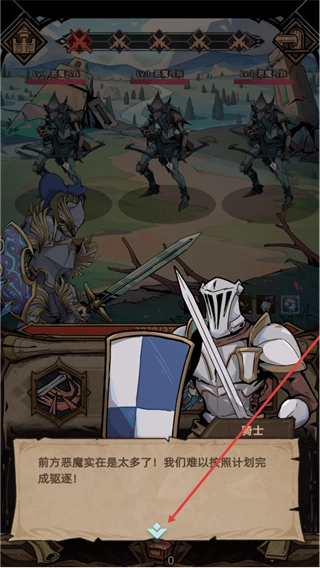 进入剧情界面后,发现前方的恶魔数量实在太多了!按原计划进行驱逐相关的对话已经不太现实,现在需要点击界面上的箭头按钮推进剧情,为接下来的战斗做准备。