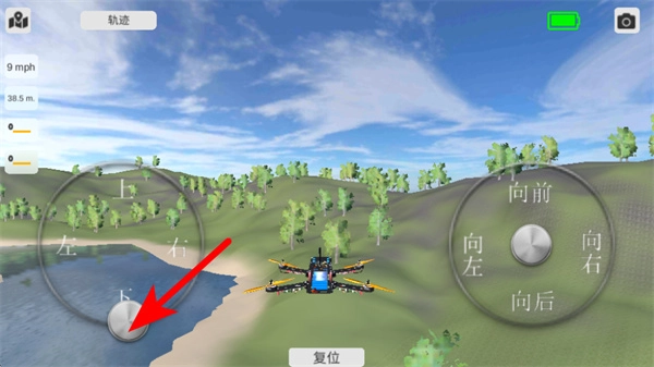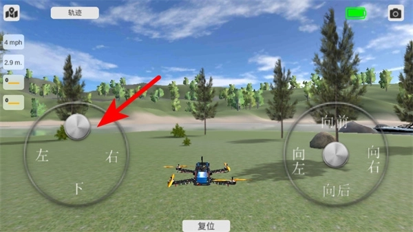 操控无人机时,拖动左侧操控盘的按钮,能够控制无人机朝左、右、下三个方向移动,以此调整其在场地中的位置。