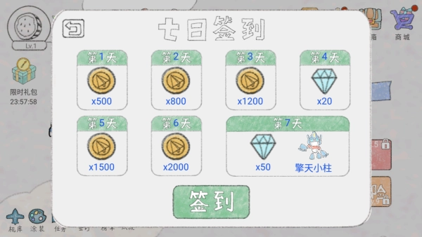 2、专业的签到功能,每日签到可领取金币与钻石,用于解锁新飞机。