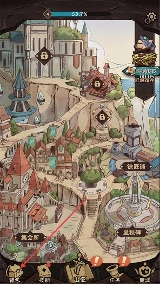 在游戏主界面,点击底部的背包按钮就能进入物品管理界面,该界面中还设有铁匠铺、里森堡等功能建筑,之后可以借助这些建筑开展装备打造相关操作。