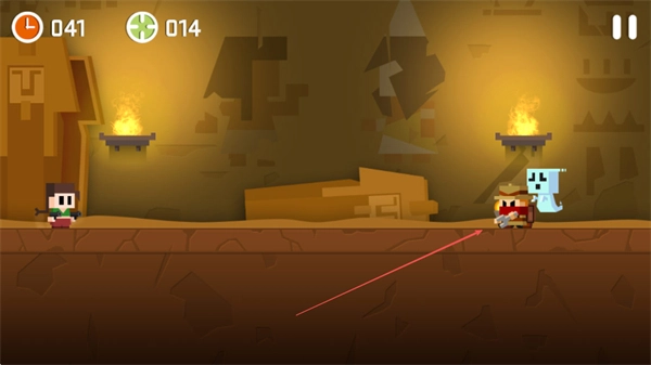 《古墓英雄》是一款以盗墓为主题的动作游戏,整体采用复古像素风格与横版2D画面设计,无论是主角角色还是墓室中的怪物,都以方块造型呈现;背景色调偏向黑暗,再搭配上泛黄的火光效果,共同营造出阴森恐怖的墓穴氛围。游戏操作方式为触屏操控,玩家只需用手指点击屏幕的左右两侧,就能控制主角进行射击——不过需要注意的是,射击方向与点击方向保持一致,但主角的身体会向相反方向跳跃。玩家将在惊险刺激的墓室探索过程中,体验到这种独特动作操作带来的乐趣。