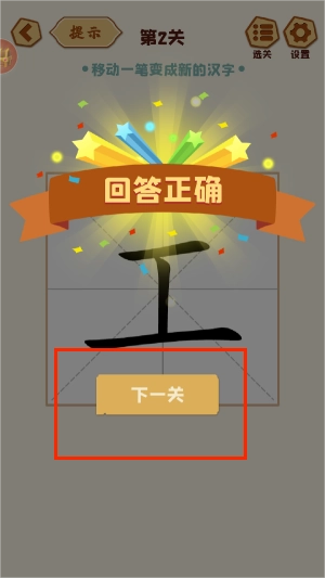 成功变形后,界面会弹出“回答正确”的提示,点击“下一关”即可继续挑战。每次通过关卡,都能获得不同的传统汉字知识小贴士。