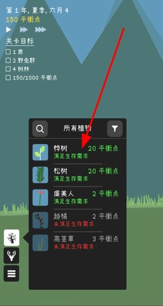 种植植物时,可挑选桦树、松树这类植物来栽种,以此满足生存所需,找到平衡点,进而推动关卡目标的达成。