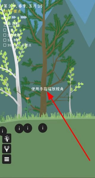 通过手指的缩放操作来调整视角大小,从而浏览小松林的各个区域,观察动植物的生长状态,以此来优化经营策略。