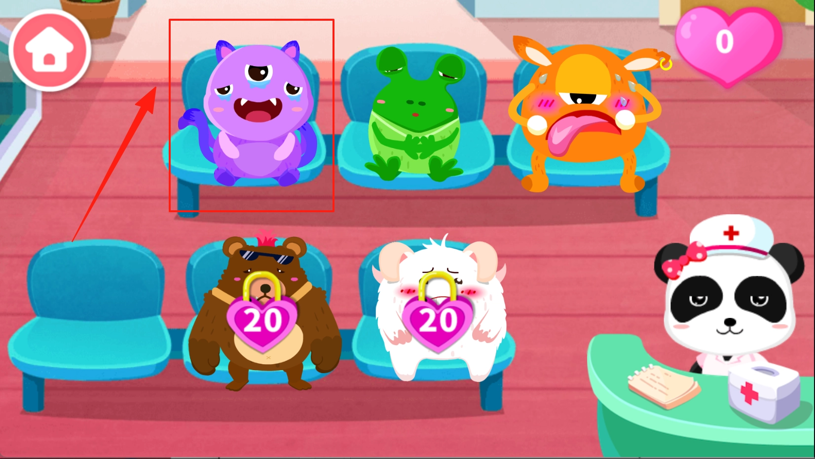 进入医院后,能看到不少怪物病人在等着我们治疗,我们可以先挑选一个病情较重的病人来医治。