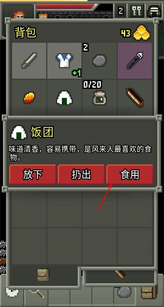 在背包界面进行物品管理,饭团能够通过食用恢复状态,武器可以通过装备提升战力,此外还能够查看物品的附魔、特性等各项属性。