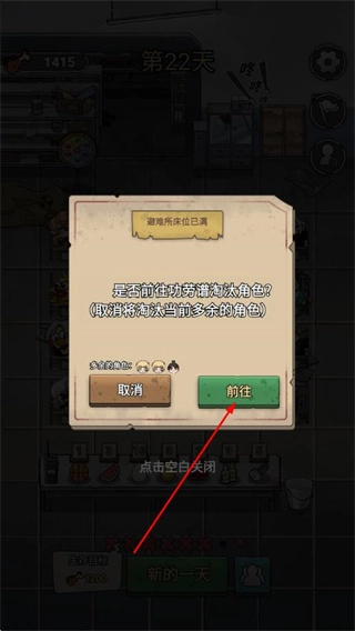 当屏幕上出现“避难所床位已满”的提示框时,点击“前往”按钮,即可进入功劳簿页面。