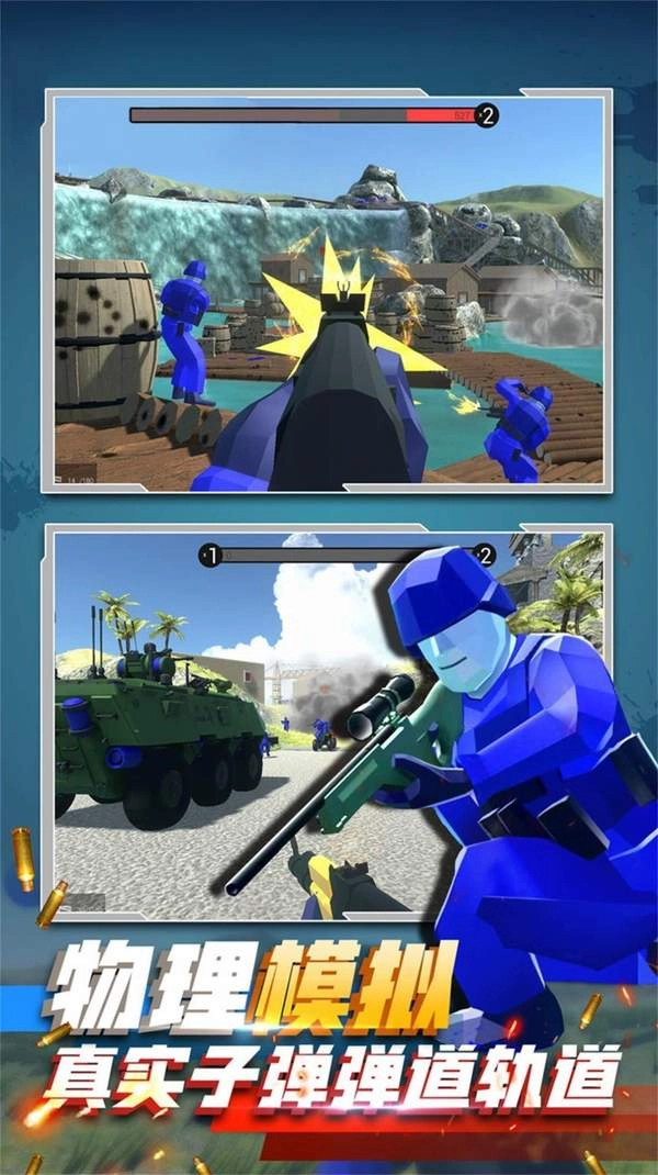 《兵人射击对决挑战》采用第一人称视角,让玩家沉浸式体验紧张刺激的射击战斗。游戏里,玩家需应对形形色色的敌人,借助手中的武器与战术技能,完成各类任务和挑战。该游戏设有多种游戏模式与地图,每个地图都具备独特的战斗环境和任务目标,能为玩家带来别样的游戏体验。