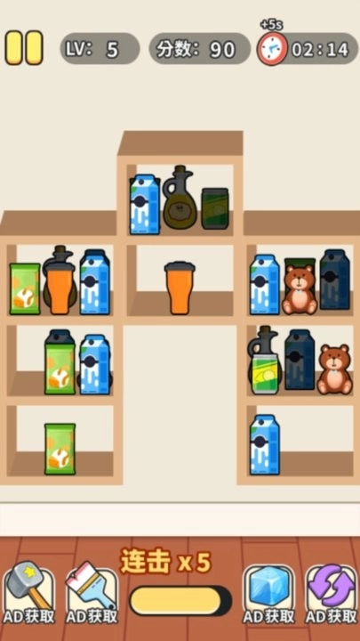 基础消除玩法:拖动相邻的商品,让三个或三个以上同品类的商品匹配,以此来腾出货架的空间。
