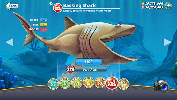 玩家刚进入游戏时,可能会以为鲨鱼最高只能解锁到XXL级,实际上游戏里鲨鱼的最高解锁等级是!!级,对应的正是巨齿鲨。