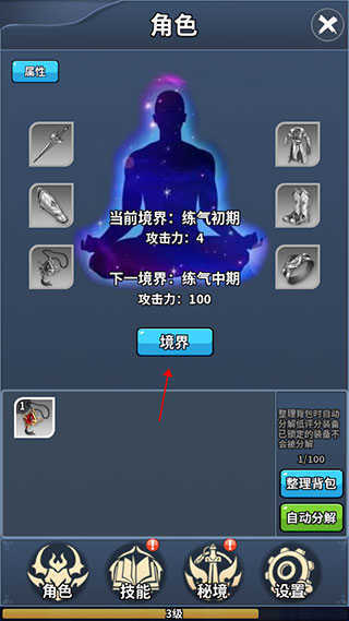 2、再点击中间的境界按钮。