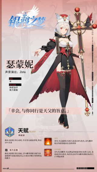 当她身上不存在减益效果时,会提升自身的信念;并且有一定概率让对方的信念降低。双方信念属性的差距越大,触发减益抵抗的概率就越高。随着练度的提升,她还能进一步提高自身的伤害、生命值与攻击数值,从而形成独有的【稳定续航】特性。