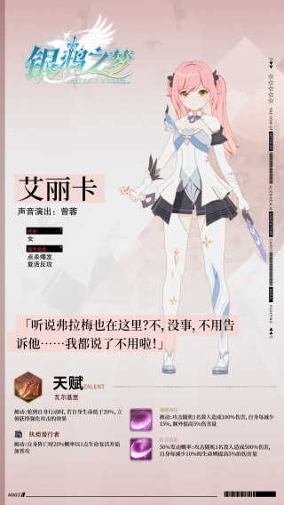艾丽卡的核心技能特点是【点杀爆发】,从技能加点就能看出她属于典型的“卖血型”角色——以自身血量为核心机制输出伤害,伤害形式为点杀式且持续递增,最终能实现爆发性的输出效果。在阵容搭配方面,艾丽卡更适配后期输出流派:前期通过主动掉血积累能量与伤害,后期搭配一名奶妈保障生存,就能让她的伤害更上一层楼;当然也可以和同样具备卖血能力的队友(比如忒路安)组队,走极致爆伤的路线。而在“助战”功能上,她的技能特点是【复活反攻】,具体效果是为被助战的伙伴提供概率复活的机会,并且复活后会追加一次普攻。这个词条比较适合普攻伤害高的伙伴,例如搭配主角本身的单体输出能力就很合适。