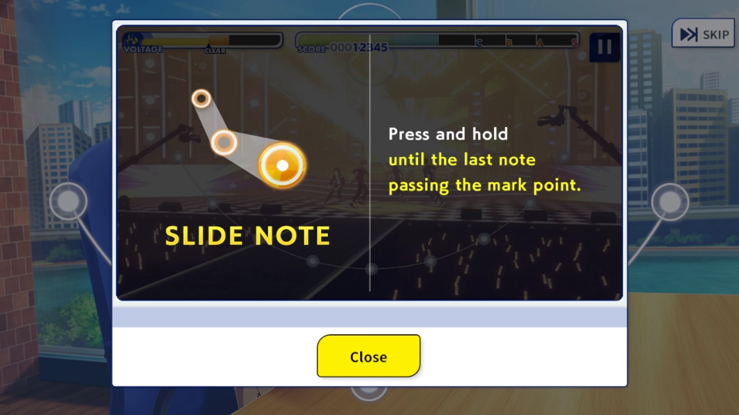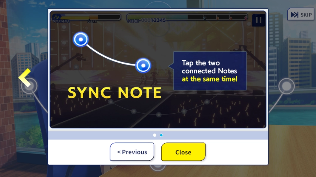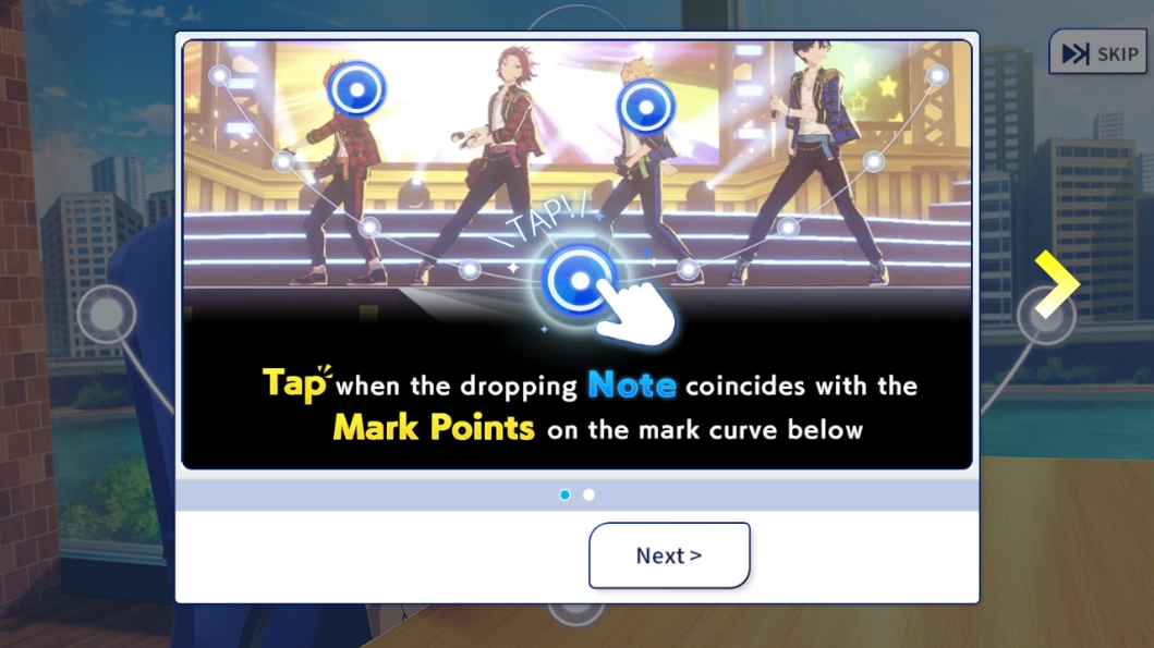 3、对话结束后会弹出一段教程,玩家可以仔细阅读;下图所展示的操作提示是:当落下的蓝色圆形与下方标记曲线上的白点重合时,玩家需要点击对应位置。