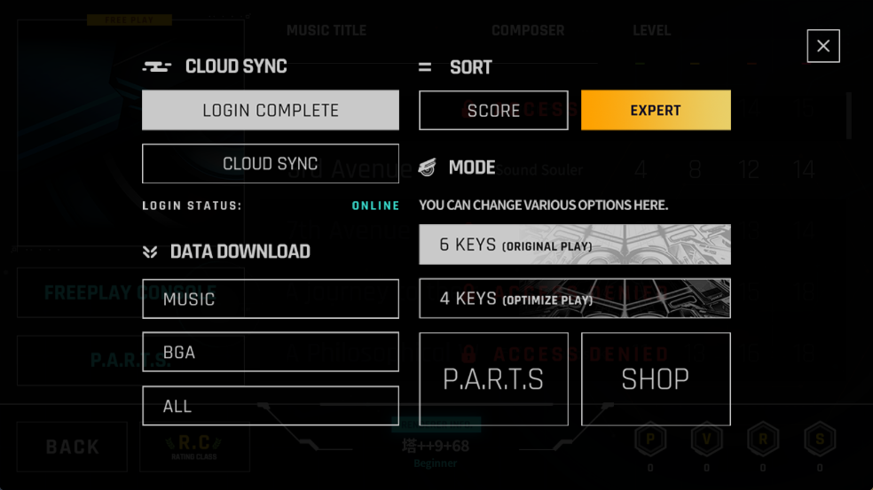 3、玩家点击界面左侧的FREEPLAY CONSOLE后,可进行登录账户、查看游戏数据、调整歌曲难度、选择按键数量等操作,还能进入商店开展相关操作。