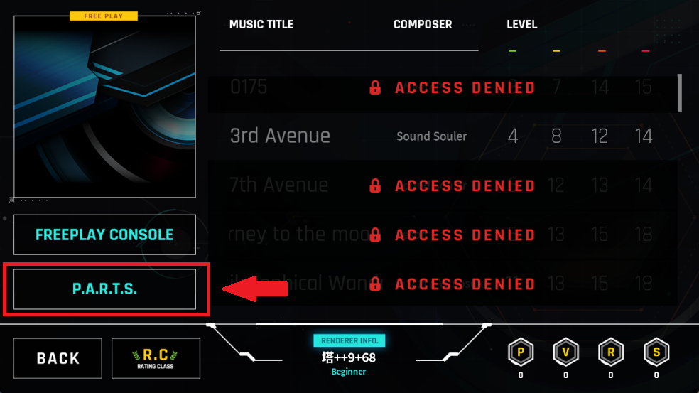 4、在界面左下角的P.A.R.T.S区域,你可以对打歌界面的按键样式、滑轨设计以及点击特效等视觉元素进行更换,以此提升游戏体验。