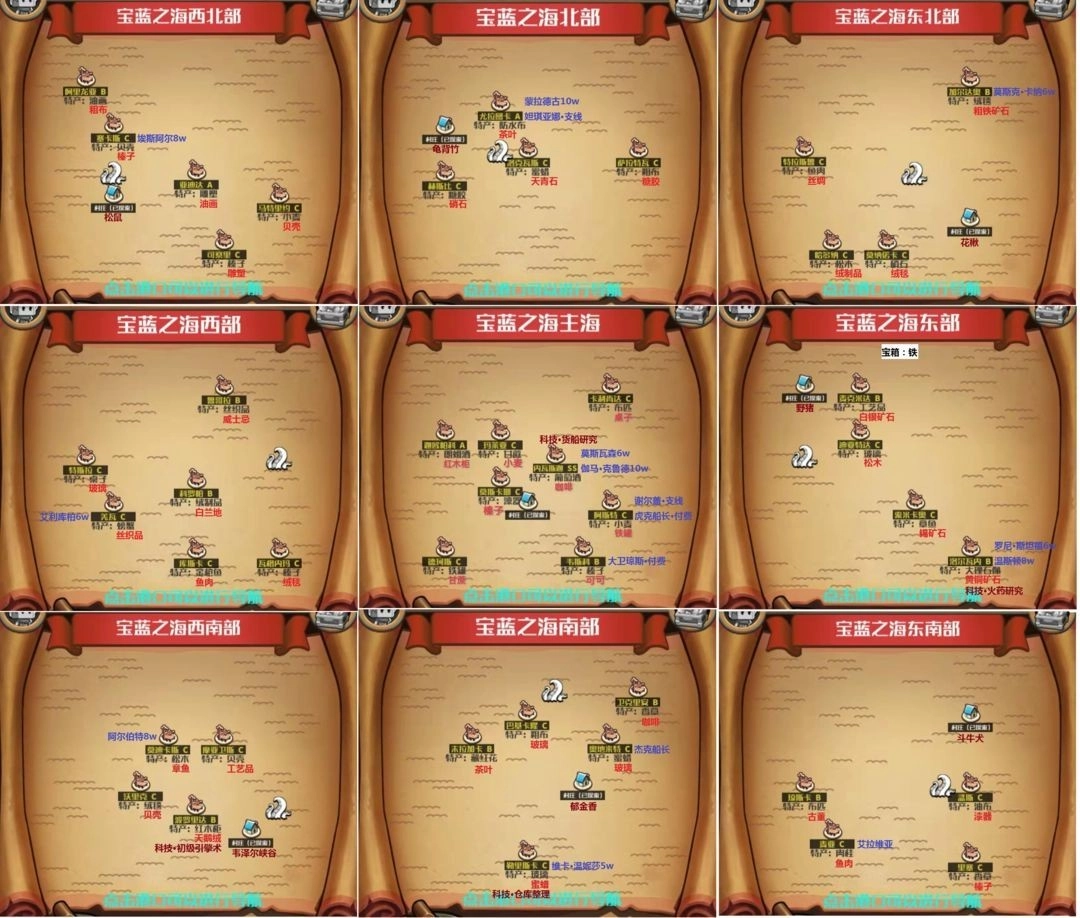 这张是之前的图,除了八爪鱼和海蛇的位置互换了,其他基本都一样,缺什么物资可以对照着打。建议花六块钱买个搜刮功能,每六个月会有一次三倍战利品的机会,用这个时机去打海怪挺合适的,海怪难度不高,而且海盗的强度和海怪的强度是成正比的。
