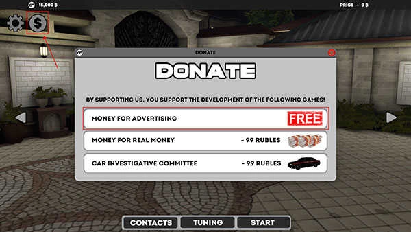 2、若玩家当前拥有的金币不足以驾驶目标车辆,可点击左上角的“金币”图标,然后选择第一个“free”选项,这样就能免费获取5000金币。