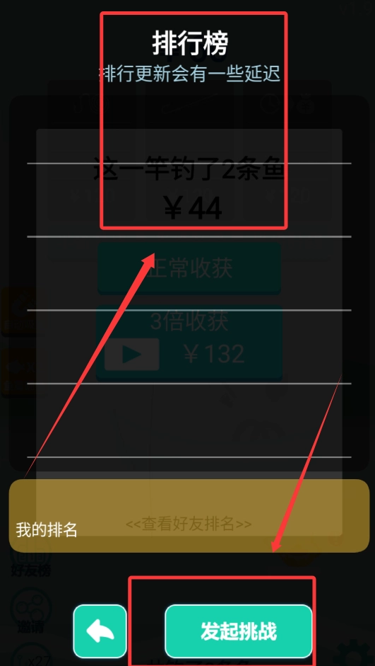 3,可以点击查看排行榜,瞧瞧自己的钓鱼技术在好友里排第几名,还能向好友发起挑战呢。