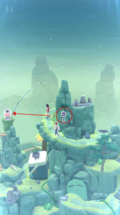 21、重新点亮的【提灯】能够驱散登顶前的迷雾,不过我们暂时不用取下木梯上的【提灯】,先让F将木梯升到被迷雾包裹的【风铃】处,再让主角们向前移动,让F拉动【风铃】来激活对应砖头上的【黑莲花】。