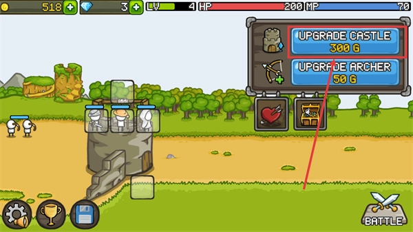 战斗结束后,点击【UPGRADECASTLE】按钮,来提升城堡的等级。