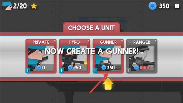 在单位选择界面,按照提示点击“GUNNER”(炮手),消耗350资源召唤该单位,以此丰富作战阵容。