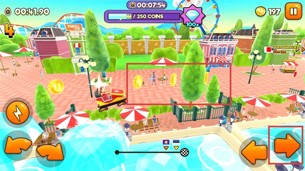 在游乐园场景里操控【红色小车】移动,借助左右方向键收集路上的【金币】,积累分数来推动游戏进程。
