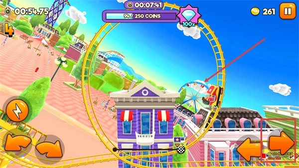 操控小车在【环形过山车轨道】上行驶,途经特技路段时要维持平衡,利用轨道的加速功能来获取额外分数和奖励道具。