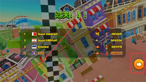 完成关卡后,点击【继续按钮】进入下一关挑战难度更高的赛道。