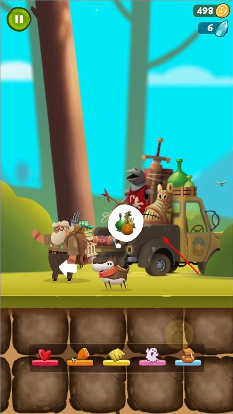 在挖掘地面的过程中,泥土块里会冒出各种各样的物品,只要狗狗靠近就会自动把它们捡起来。不过游戏前期背包的容量特别小,往往装两个东西就满了,所以基本挖不了多久就得返回地面去卖东西。卖东西的商人在地图的最左边,只要靠近他并稍作停留,背包里的物品就会自动出售,这个设定倒是挺省心的,不用担心会不小心把需要的道具卖掉。