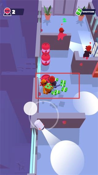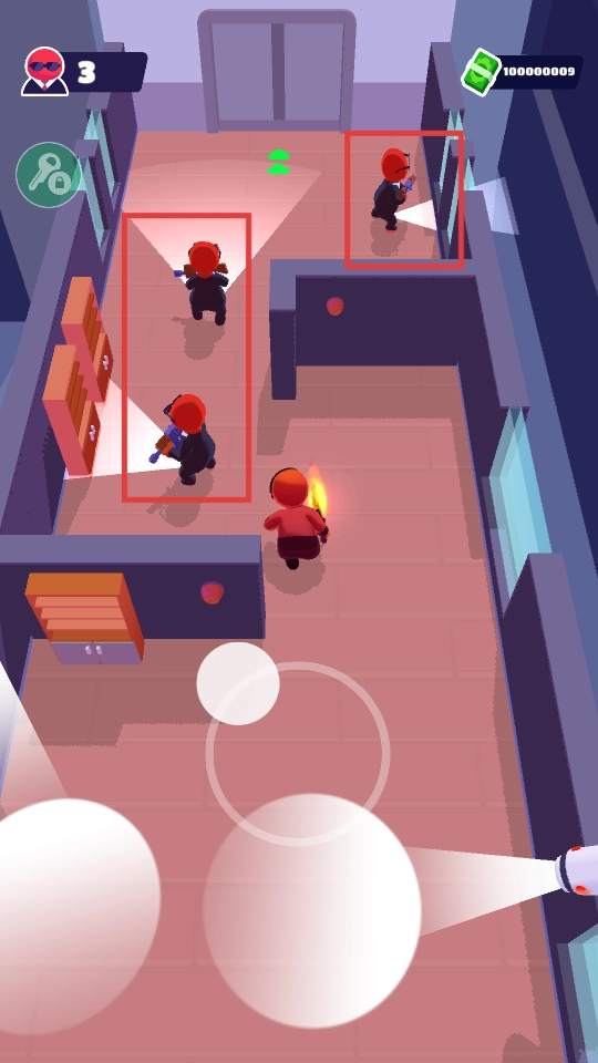 操控角色在击败敌人的过程中收集绿色物品,借助场景中的遮蔽物避开监控设备,逐步推进关卡进程。