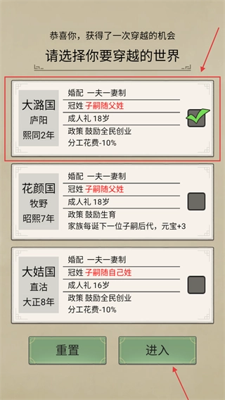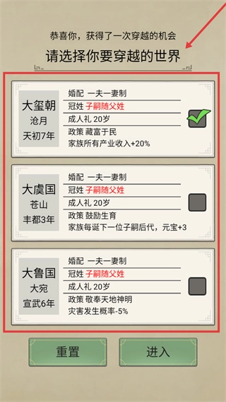 在选择开启世界穿越之旅时,建议优先考虑【大玺朝】。这里推行的家族产业收入提升20%的政策,能有效帮助穿越者在初期阶段快速积累财富与资源。