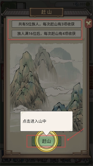 当族人数量达到5位时,点击【赶山】可获得3项收获;族人数量满16位后,收获将增加到4项。合理扩展族群规模,能够有效提升收益。