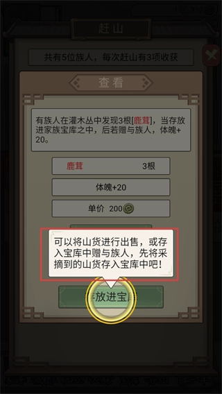 在山中猎取到【鹿茸】后,把它【存入宝库】,之后将其赠送给族人,能够提升他们的体魄属性,进而增强家族成员的整体能力。