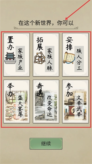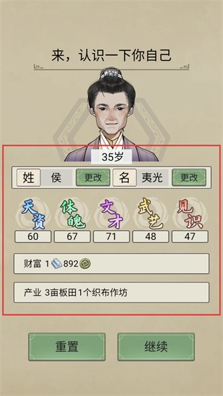 创建角色时能够对姓名与属性进行调整,要保证【文才】或者【体魄】的数值处于较高水平,在确定初始产业之后点击继续,以此开启家族故事。