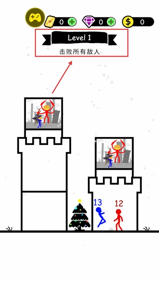 击败当前敌人后继续推进,操控数值为13的蓝色火柴人去应对剩余敌人,朝着击败所有敌人的目标前进。