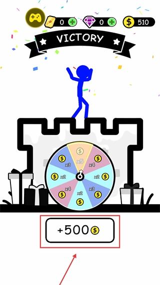 成功消灭所有敌人后会触发【VICTORY】状态,此时能领取【+500$】的金币奖励,之后可以通过转盘抽取额外奖励,也可以直接进入下一关。