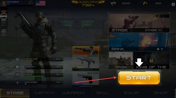 进入游戏界面,选好武器后,点击【START】按钮,就能开启战斗召唤的枪战之旅。