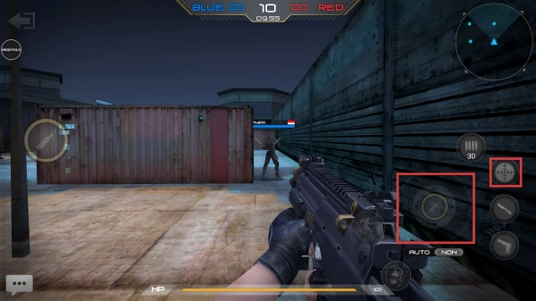 战斗时,通过右侧按键来操控射击与瞄准,灵活进行操作,以此应对敌人的进攻。
