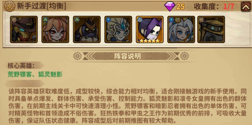 3、阵容说明:该阵容英雄获取难度低,成型较快,综合能力相对均衡,适合刚接触游戏的新手使用。同时具备单点爆发、群体伤害、承受伤害、控制能力。狐灵魅影和凛冬女皇拥有出色的群体伤害,在前期主线关卡中可快速清理小怪。荒野镖客和暗影忍者拥有出色的单体伤害,可对精英怪物和首领造成不俗伤害。狂热铁拳和甲虫之王作为前期优秀的前排,可吸收大量伤害,保证队伍状态健康。阵容成型后对前期推图有较大帮助。