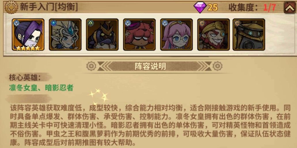 3、阵容说明:该阵容英雄获取难度低,成型较快,综合能力相对均衡,适合刚接触游戏的新手使用。同时具备单点爆发、群体伤害、承受伤害、控制能力。凛冬女皇拥有出色的群体伤害,在前期主线关卡中可快速清理小怪。暗影忍者拥有出色的单体伤害,可对精英怪物和首领造成不俗伤害。甲虫之王和腹黑萝莉作为前期优秀的前排,可吸收大量伤害,保证队伍状态健康。阵容成型后对前期推图有较大帮助。