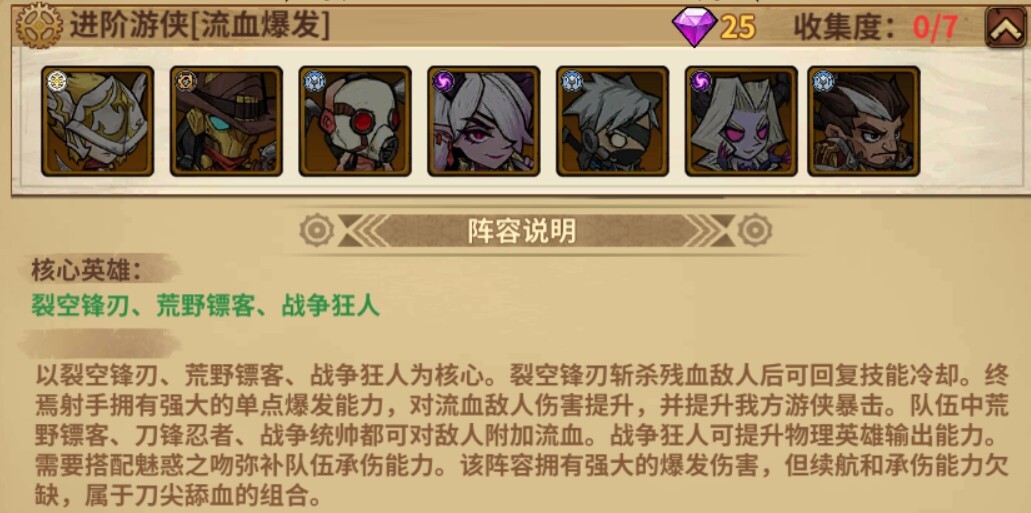 3、阵容说明:以裂空锋刃、荒野镖客、战争狂人为核心。裂空锋刃斩杀残血敌人后可回复技能冷却。终焉射手拥有强大的单点爆发能力,对流血敌人伤害提升,并提升我方游侠暴击。队伍中荒野镖客、刀锋忍者、战争统帅都可对敌人附加流血。战争狂人可提升物理英雄输出能力。需要搭配魅惑之吻弥补队伍承伤能力。该阵容拥有强大的爆发伤害,但续航和承伤能力欠缺,属于刀尖舔血的组合。