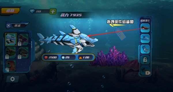 3、收集到的稀有机械零件会实时装配在鲨鱼体表,其外观会随着装备的升级持续发生变化与进化。