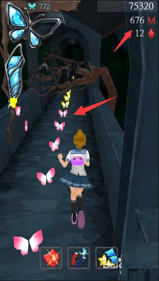 蝴蝶并非装饰,而是游走于长廊缝隙间的稀有灵体。高速奔跑时留意墙角微光、天花板裂隙或镜面倒影,及时滑动捕捉。收集越多,结算评分越高,金币奖励越丰厚。
