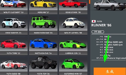 车库里有超多汽车品牌和型号可供挑选,选好后点击右下方的生成按钮,就能驾驶全新的车辆啦。
