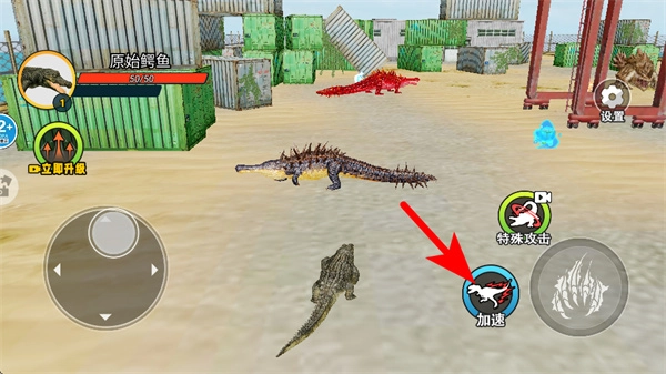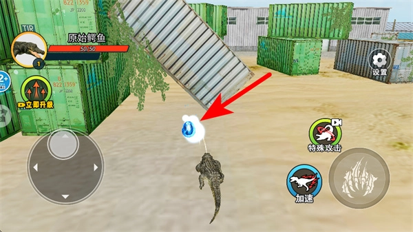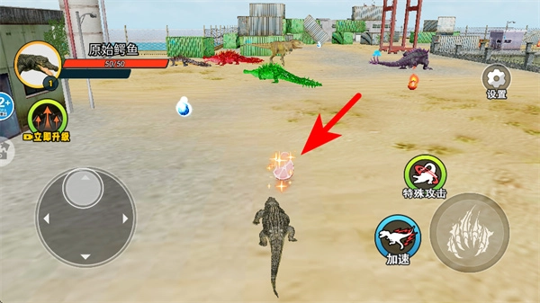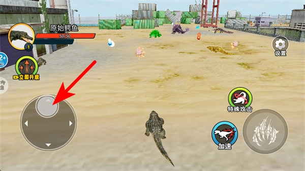 进入场景后,通过虚拟摇杆操控幼年鳄鱼在周围区域展开探索。当发现可以食用的物品或者实力较弱的猎物时,便主动发起攻击,以此来获得经验值;而要是遇到大鳄鱼这类天敌,就得马上进行躲避,防止被它们捕食。
